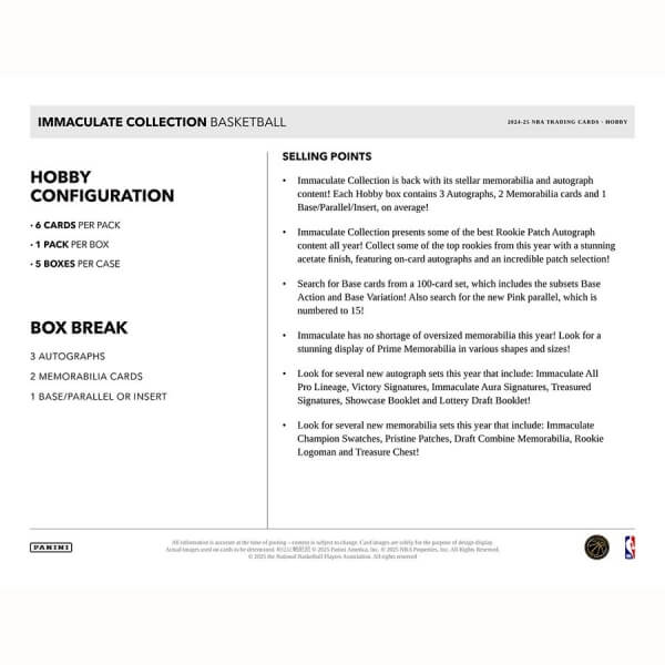 2024-2025 Panini Immaculate Collection NBA Basketball Hobby Box is a pack of 6 NBA cards. This is one of the rarest NBA boxes. There are only 6 rare cards in the pack. Collect some of the best rookies from this year, autographs or memorabilia. Five of the six cards in each hobby box are hits.