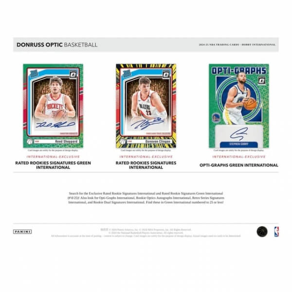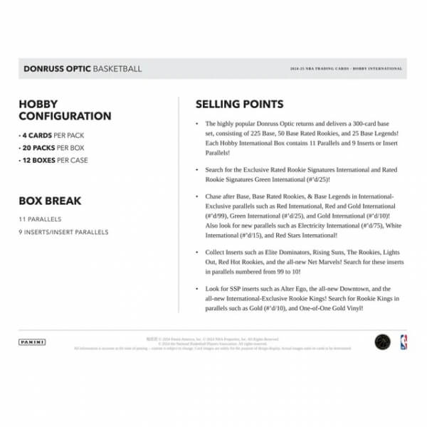 2024-2025 NBA Cards Panini Donruss Optic International Hobby Box is a pack of NBA collectible cards. The pack contains 20 packs of 4 cards. In total, you get 80 rare cards. This is a product suitable for advanced collectors, because in it you will get a large number of special cards that will enrich your collection.