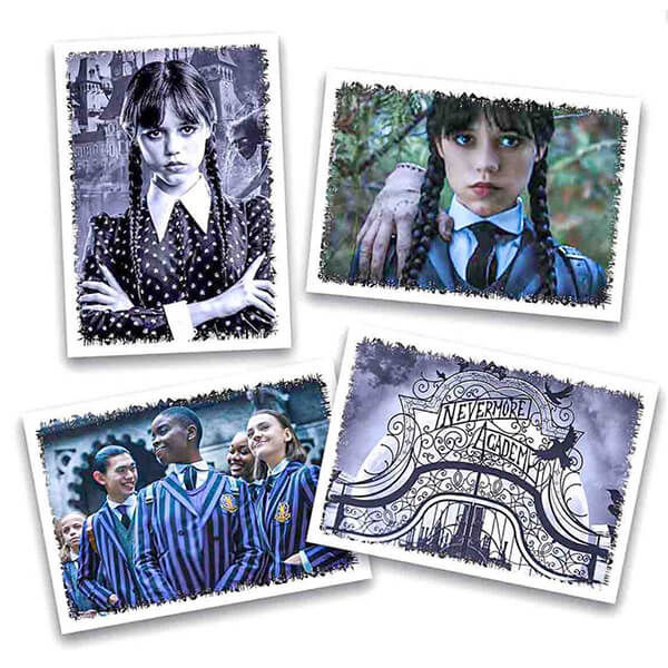 A pack of stickers for a collector's album with the motifs of the popular heroine of the Wednesday series. There are 5 randomly inserted stickers in the pack for sticking in the album. Let the kids make a beautiful album with their heroine.