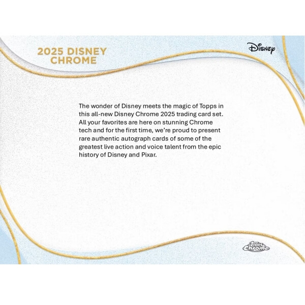 Collect the 200-card base set on stunning Chrome tech. All your favorite Disney and Pixar characters are here - plus, for the first time, look for base cards of Disney Live Action heroes, including Jack Sparrow.