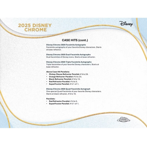 Facsimile autographs of your favorite Disney characters. Starts at Mickey Mouse Refractor, #'d to 28.