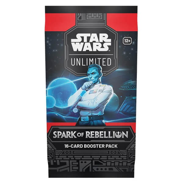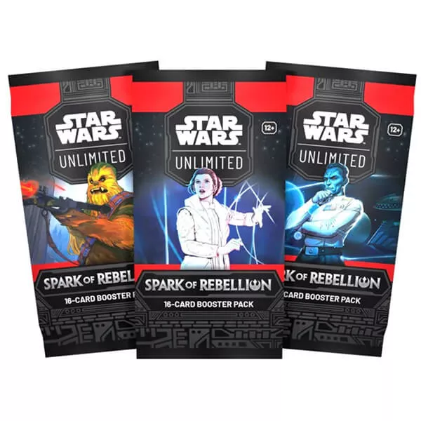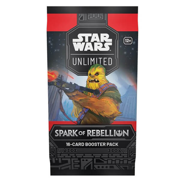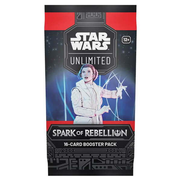 The first set of the new Star Wars: Unlimited TCG - Spark of Rebellion collectible card game. In each booster pack, you'll unwrap 16 randomly shuffled set cards based on the main characters and themes of George Lucas' legendary films.